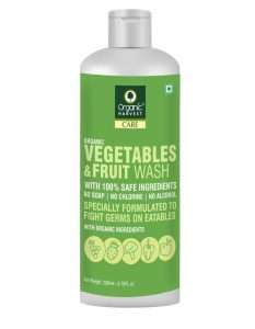 • Organic Harvest’s Fruits and Vegetable Wash is specially formulated with 100% Safe & Organic Ingredients to fight with germs on eatables. This Soap Free, Alcohol Free and Chlorine Free Fruits & Vegetable Wash sanitizes your eatables, without harming them or your body