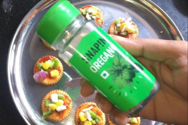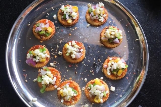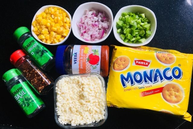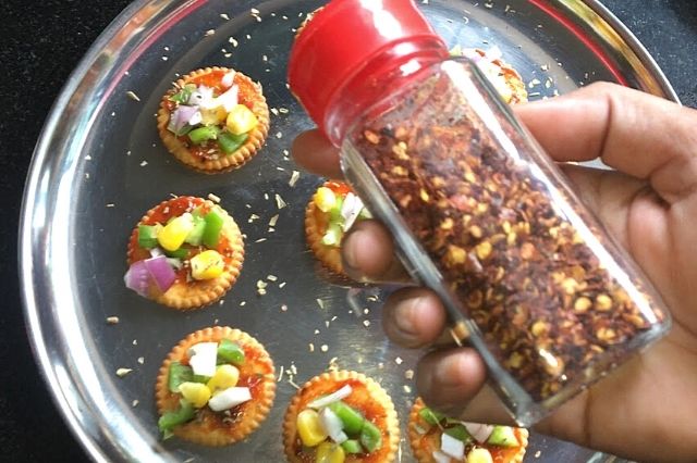 2. Add veggies as topping like chopped capsicum,onion ,boiled corn,(colorful bell peppers ,olives are optional).Add grated cheese and sprinkle basil,oregano ,chili flakes etc.